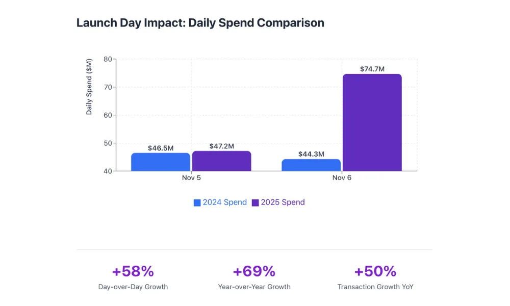 - Total daily spend reached $74.7 million, up 58.2% from $47.2 million the day before