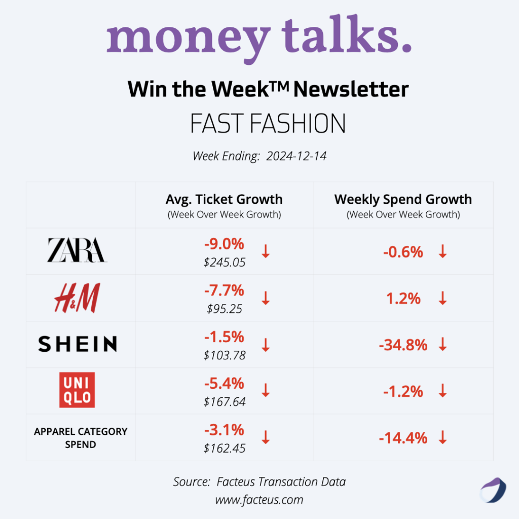 In terms of average ticket growth, SHEIN and Uniqlo had the most limited declines, with ATG dropping by 1.5% and 5.4%, respectively. H&M and Zara, on the other hand, had much larger drops in ATG this week, with drops of 7.7% and 9.0%, respectively.