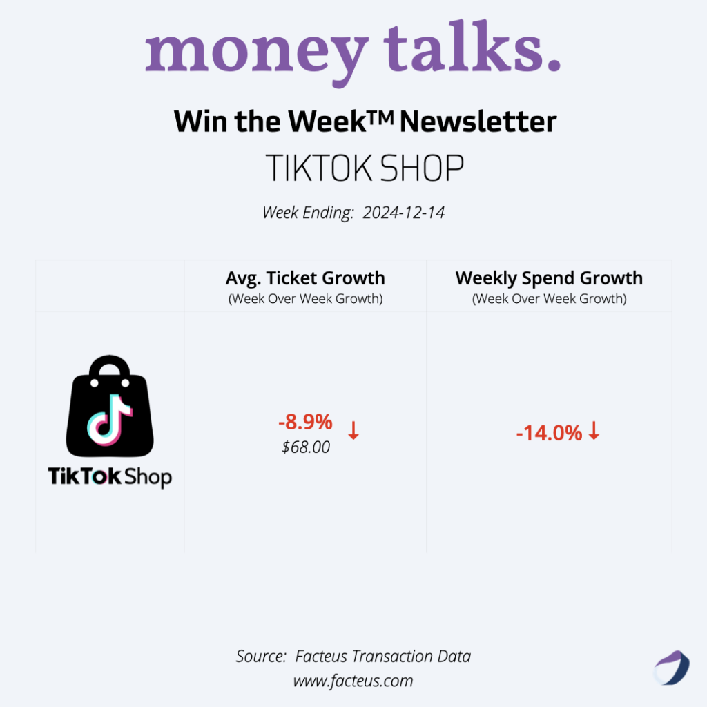 Snapping back after last week’s positive growth, TikTok Shop spending declined this week, with: